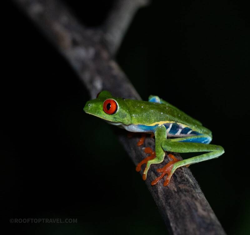 De groene beestjes met hun fel rode ogen, witte buik en blauwe poten waren heel goed te bewonderen. Wat een prachtige kikker, het boegbeeld van Costa Rica. Ik snap wel waarom.