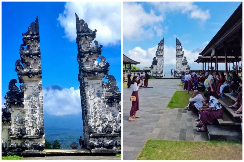 Eenmaal na een stijle klim komen we aan bij de ingang van de tempel en kijk ik mijn ogen uit. Aan de overkant zie ik de Gate of Heaven uitkijkend op vulkaan Agung, echt prachtig! Maar sjonge wat een mensen hier. Was ik naïef? Misschien..